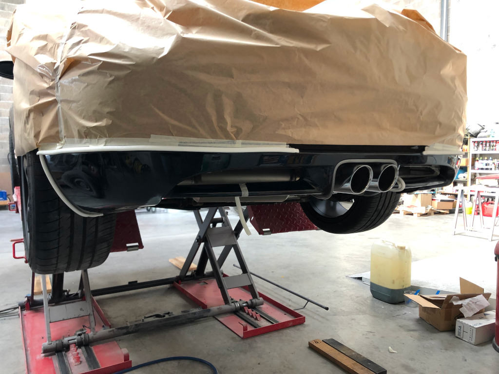 … avec un dernier souhait du client : recouvrir aussi le logo sur le coffre, afin qu’il soit noir mat – comme les roues.