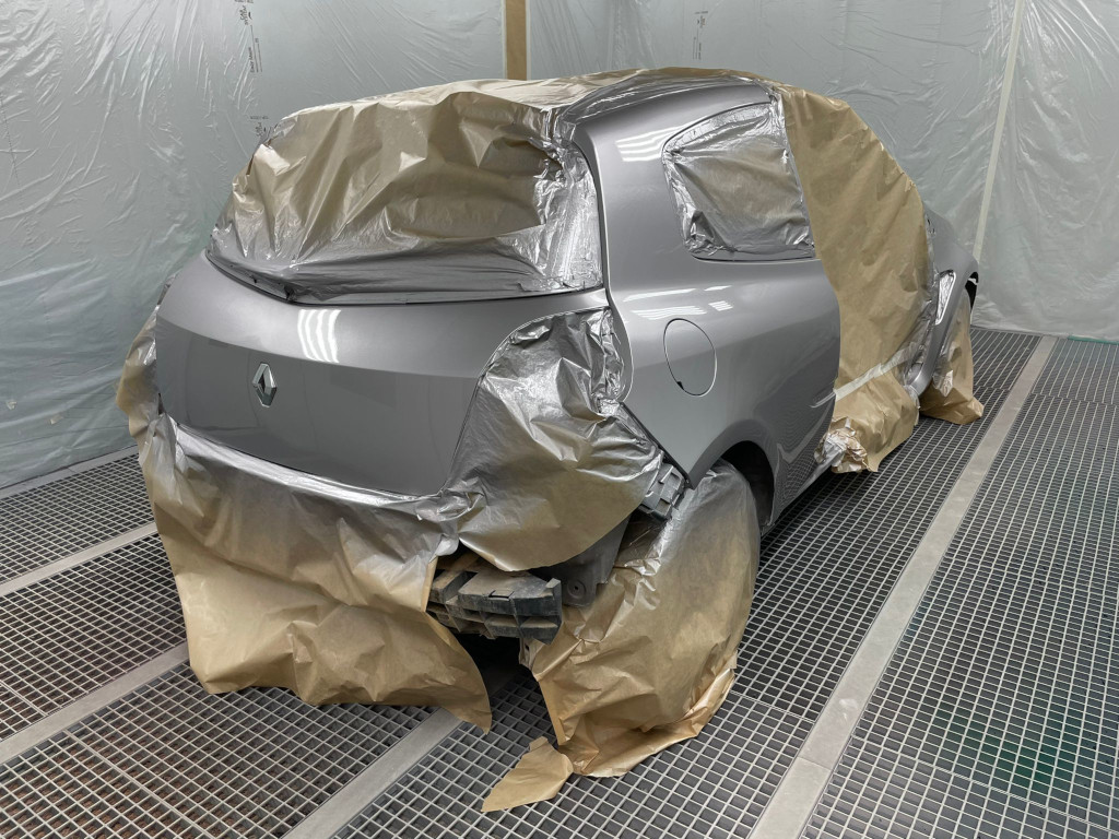 La caisse passe la première en cabine. Puis les autres éléments (pare-chocs avant et arrière, porte droite) pour finir par les plus petites pièces : rétroviseurs et baguettes.