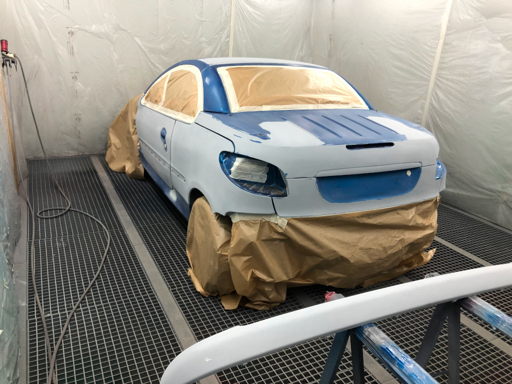 Encore un cabriolet du Lion de Sochaux qui rentre à la carrosserie, pour redressage et peinture complète.